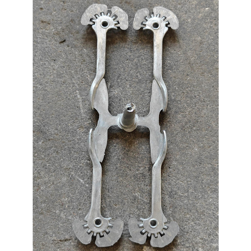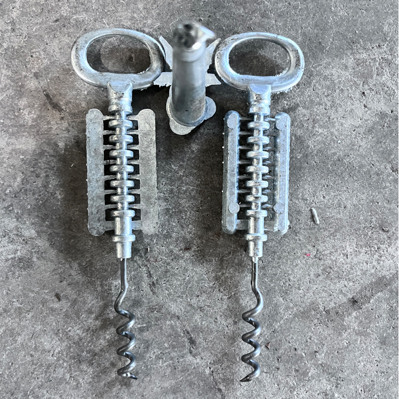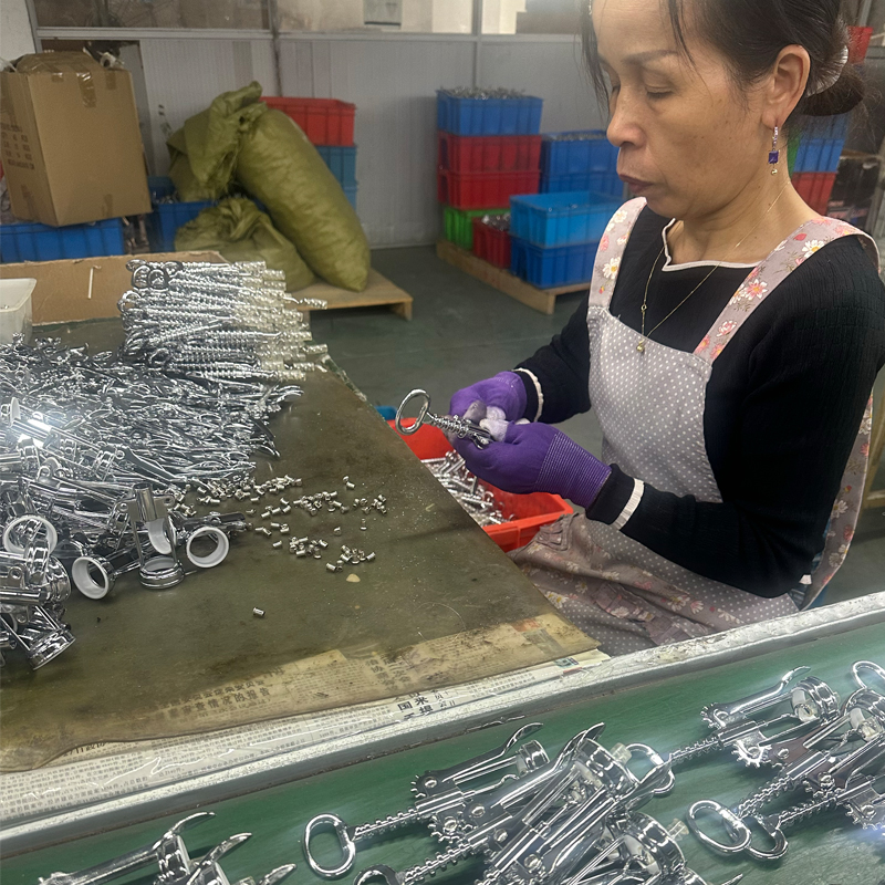 このコルクス抜きのダイカストが完了した後、この形状になり、各部品には除去する必要のあるゲートマークと余分なエッジがまだ残っているため、次の生産ステップではバリ取りが行われ、作業員は純粋な手作業を必要とします。これは、当社が製造するコルクス抜き、ガーリックプレス、ナッツクラッカー、ピザカッター、アイスクリームスクープはすべて複雑な部品であるためです。製品の表面が損傷しないようにし、その後の加工品質を維持し、スクラップの増加を避けるために、純粋な手作業が必要です。この工程の作業者には豊富な経験と十分な忍耐力が必要であり、複雑な形状の製品や金型の設計を改善するために効果的で実行可能な提案を数多く提供できます。そのため、これらの作業者は経験を積むために長期の練習が必要であり、当社ではそのような作業者を多数訓練しています。