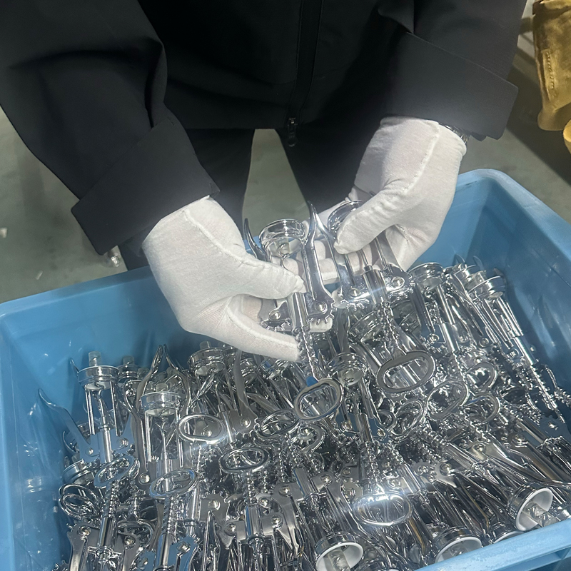 コルク栓抜きのすべてのコンポーネントのコーティングには、通常、電気めっきまたは塗装方法が使用されます。この図では、電気めっきに焦点を当てます。電気めっき処理は、外部委託されたサプライヤーによって完了します。これには、その分野で長年の経験を持つ高度に専門化された施設、機器および業界エンジニア、および多数の基礎技術者および経験豊富な作業員が必要です。これは非常に複雑なプロセスです。当社は、30 年の業界経験を持つサプライヤーと長期的な協力関係を維持し、製品の安定性を確保します。これにより、製造中に発生するさまざまな生産上の問題に、迅速かつ専門的かつ効率的に対処できるようになります。これらの取り決めは、ワインアクセサリー、キッチン用品、コルク栓抜きなどの品目の生産サイクルを確保するのに役立ち、同時に顧客の販売計画もサポートします。