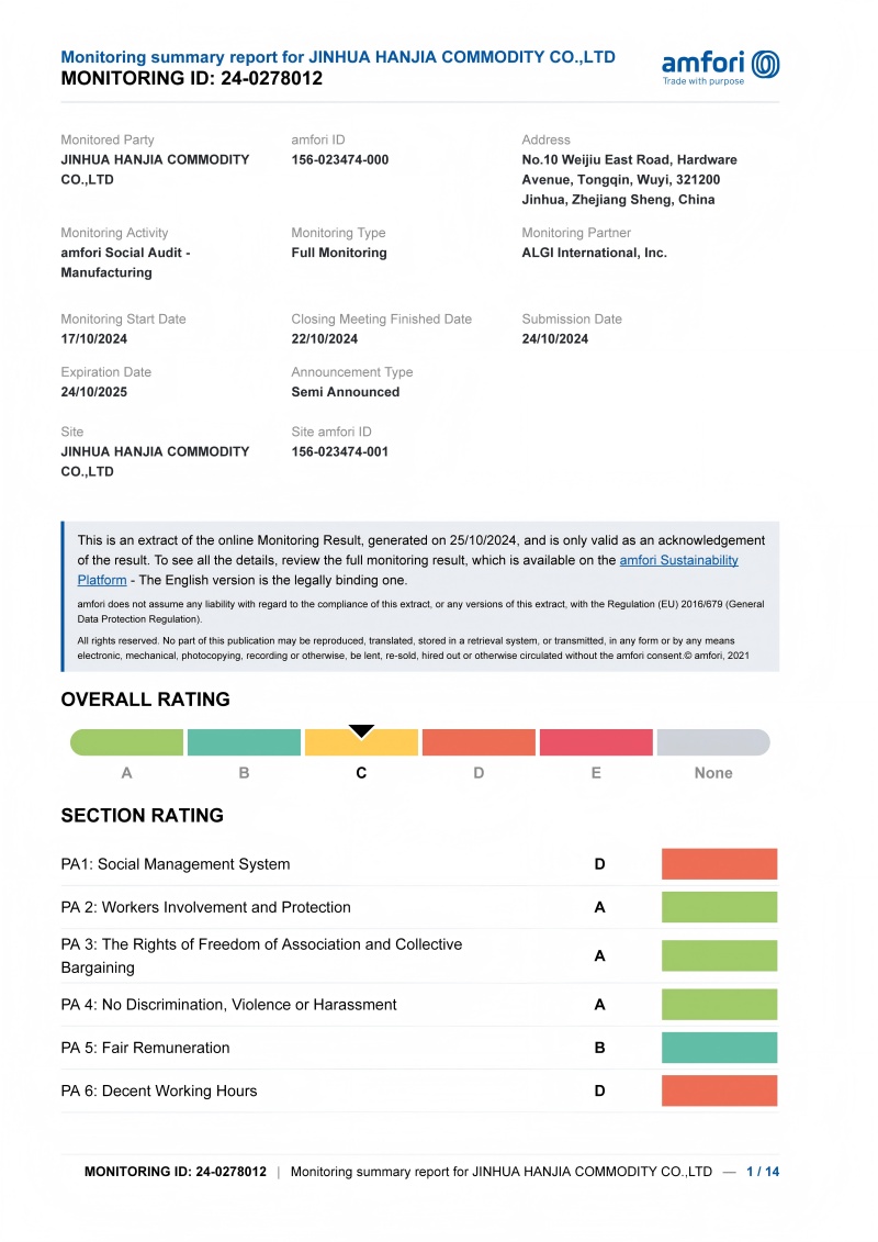 2025年7月、Jinhua Hanjia Commodity Co.、Ltd。Cooperative Union Enseigneによって任命された第三者欧州検査機関が実施した国際標準分類(ICS)ファクトリー監査プログラムのCレベル認証を成功裏に取得しました。この認定システムは、A、B、C、およびDの4つの層で構成されています。フランス商工会議所(FCD)のメンバーとして、同社は国際労働機関の社会管理スキーム標準SA8000を順守し、サプライヤーに社会的責任監査を実施しています。