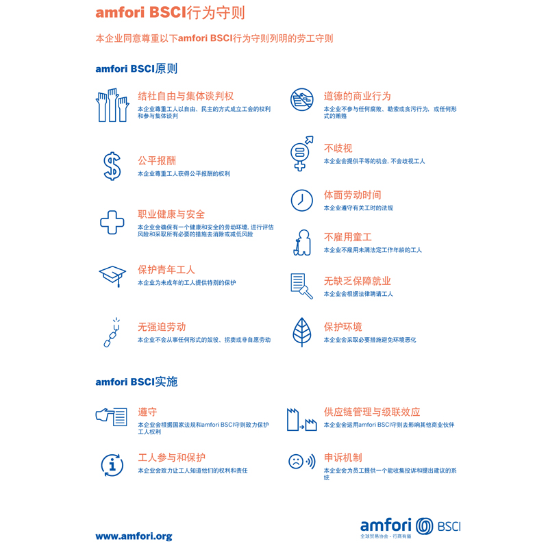 BSCI規制の要件に従って、当社はBSCI原則の効果的な実施を確保するために、Amfori BSCI行動規範に概説されている労働ガイドラインを厳格に遵守します。生産プロセス中、当社は自由かつ民主的な方法で労働組合を設立し、団体交渉に参加する労働者の権利を尊重します。また、無差別に取り組み、児童労働の雇用を回避し、労働者が公正な労働慣行と報酬を確実に受け取ることを保証します。さらに、当社は労働者が適正な労働時間とその他の基本的権利を有することを保証します。